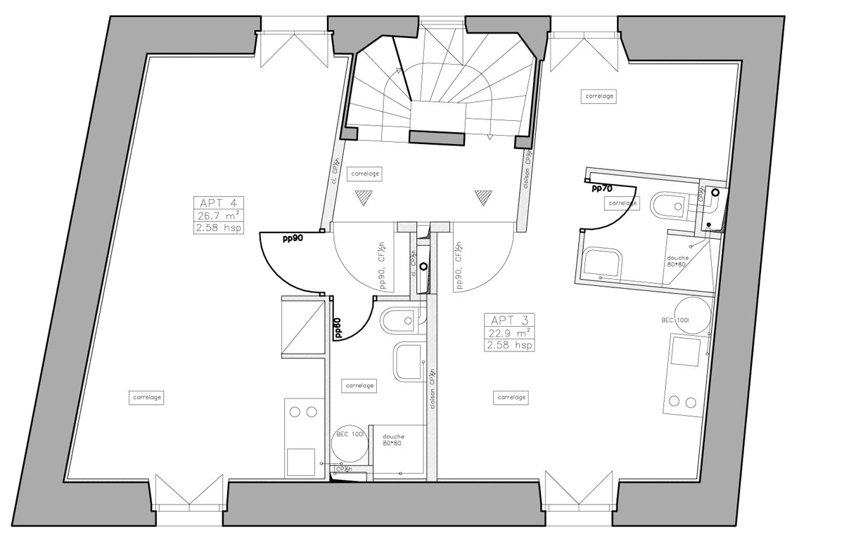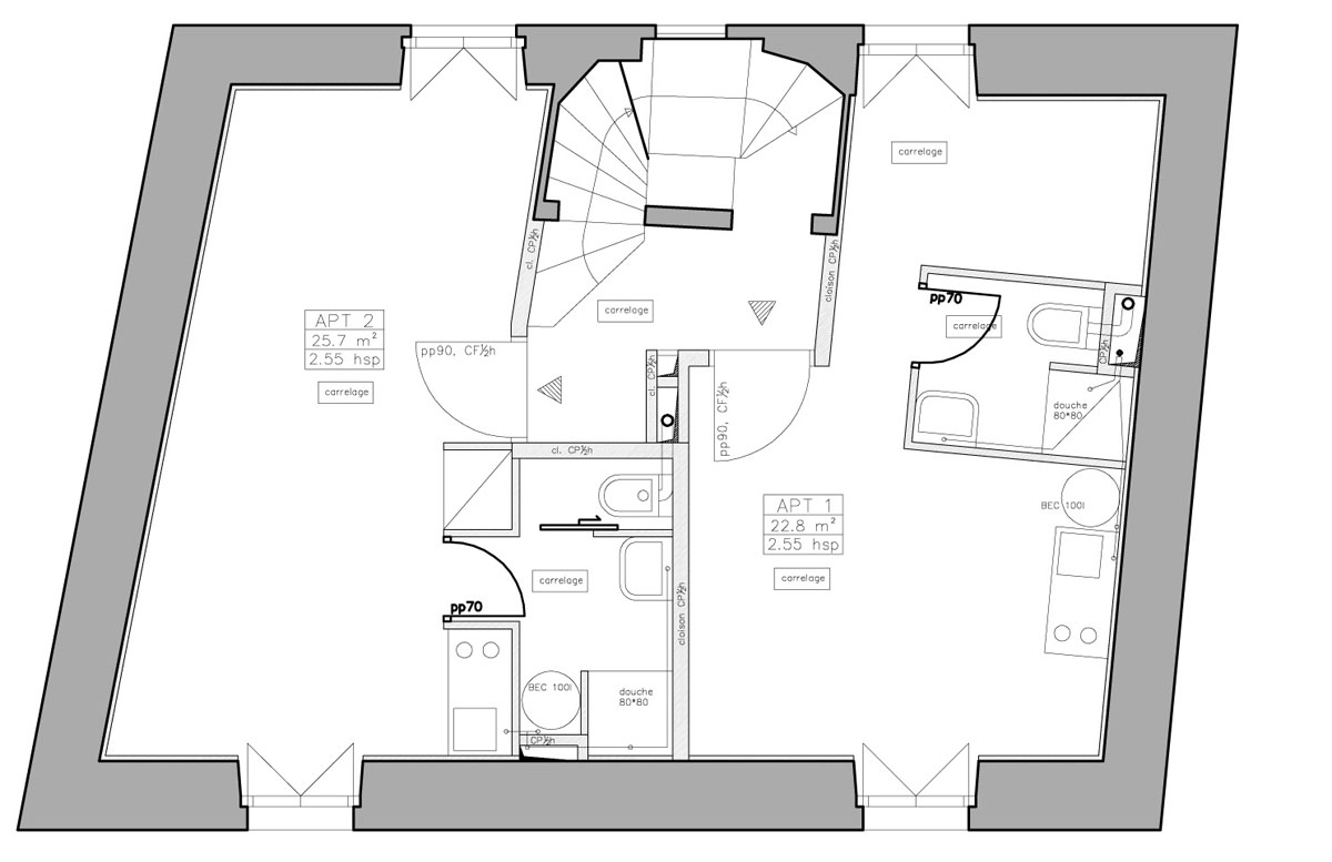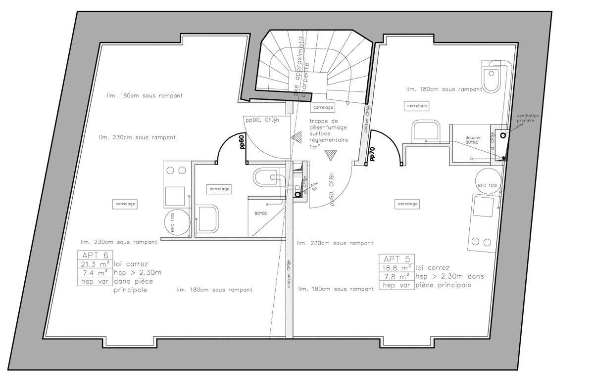 Travaux: | Reprise du Gros-oeuvre, partitionnement intérieur, vmc collective, sécurité incendie. |